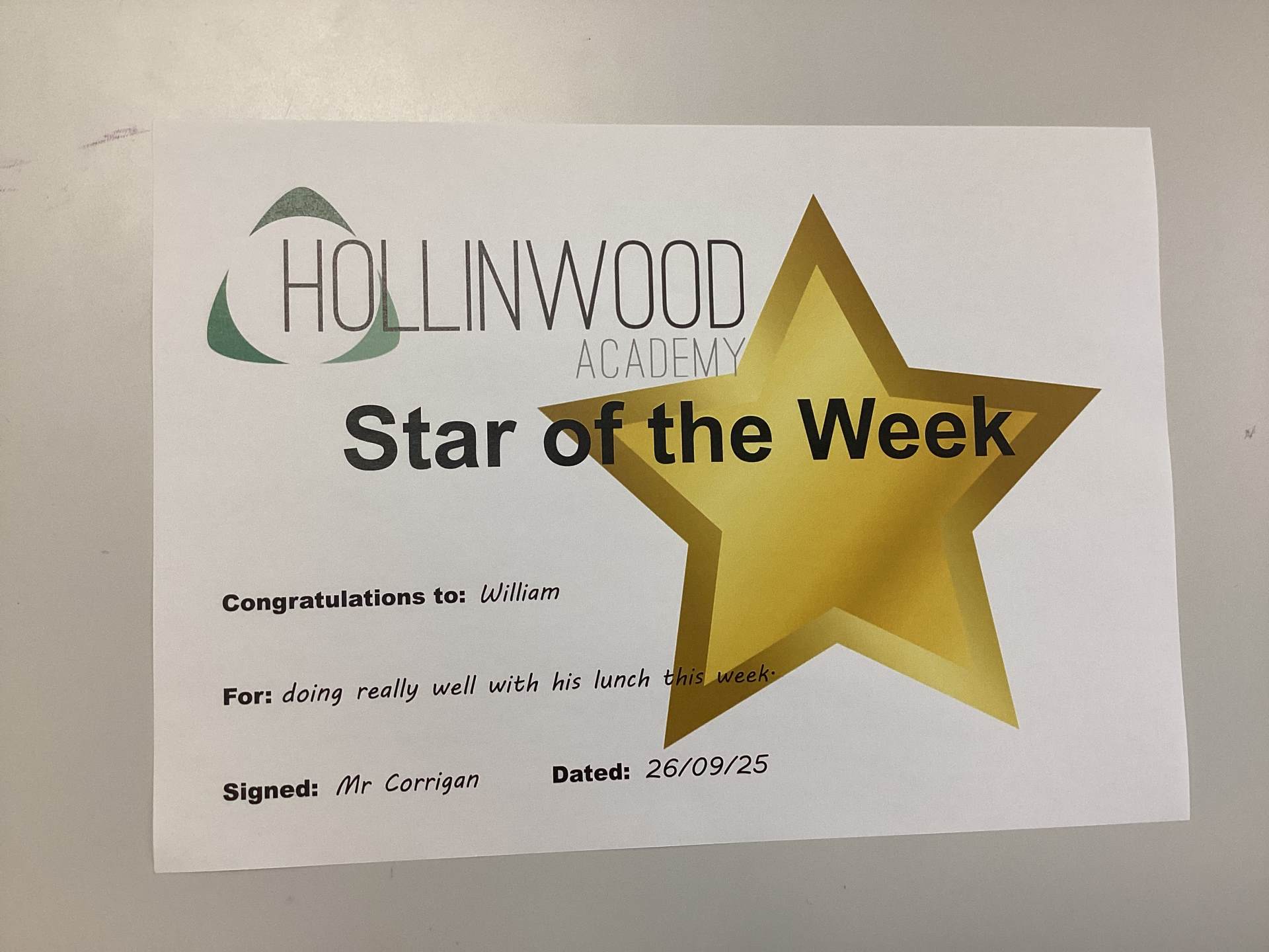 Mr Corrigan’s STAR of the Week is William for doing really well with his lunch this week.