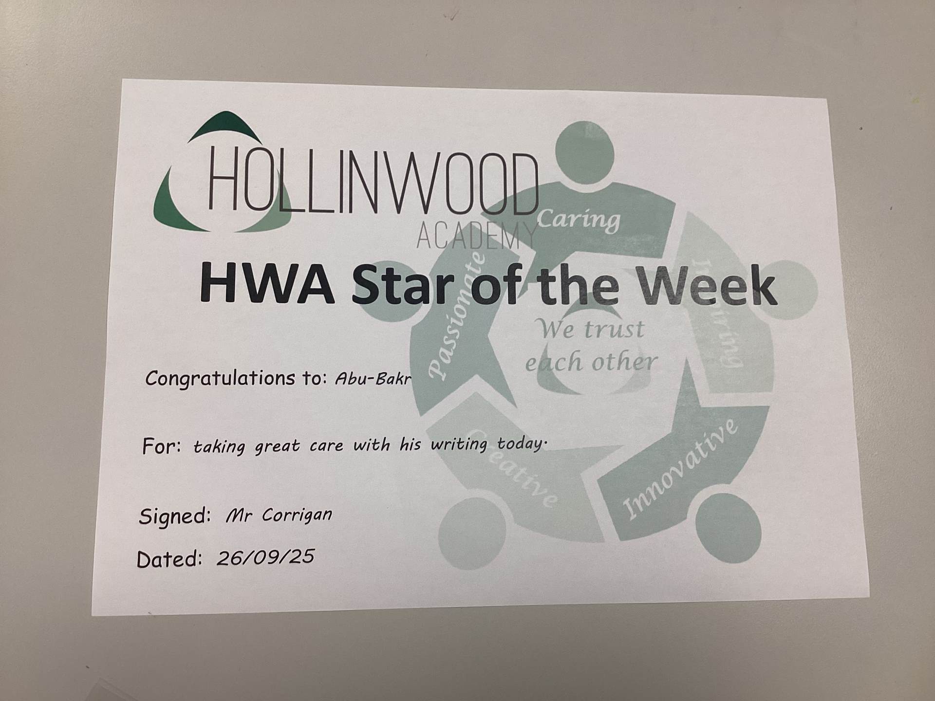Mr Corrigan’s HWA We Are Caring goes to Abu-Bakr for taking great care with his writing today.