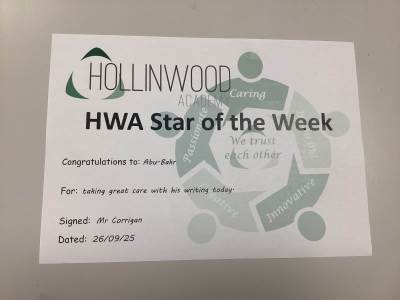Mrs McDonalds’ and Mrs Bramley’s HWA We Are Caring goes to Roman for trying hard in his lessons this week and managing his emotions with support from staff.