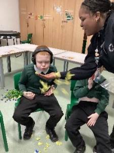 This week we enjoyed our sensory story “I Am Rabbit”, to help us with our core word focus “I,” “me,” and “my”. Children really enjoyed the props that helped to bring this story to life. Throughout the week, we have been exploring these core words in lots of different ways. We practised saying and writing I, me and my during our writing sessions and used them when talking about our own work- for example “This is my butterfly” We have been very creative. The children made beautiful butterflies, and adorable rabbits, linking to our story. The children loved choosing their own colours, decorating and adding their own touches.