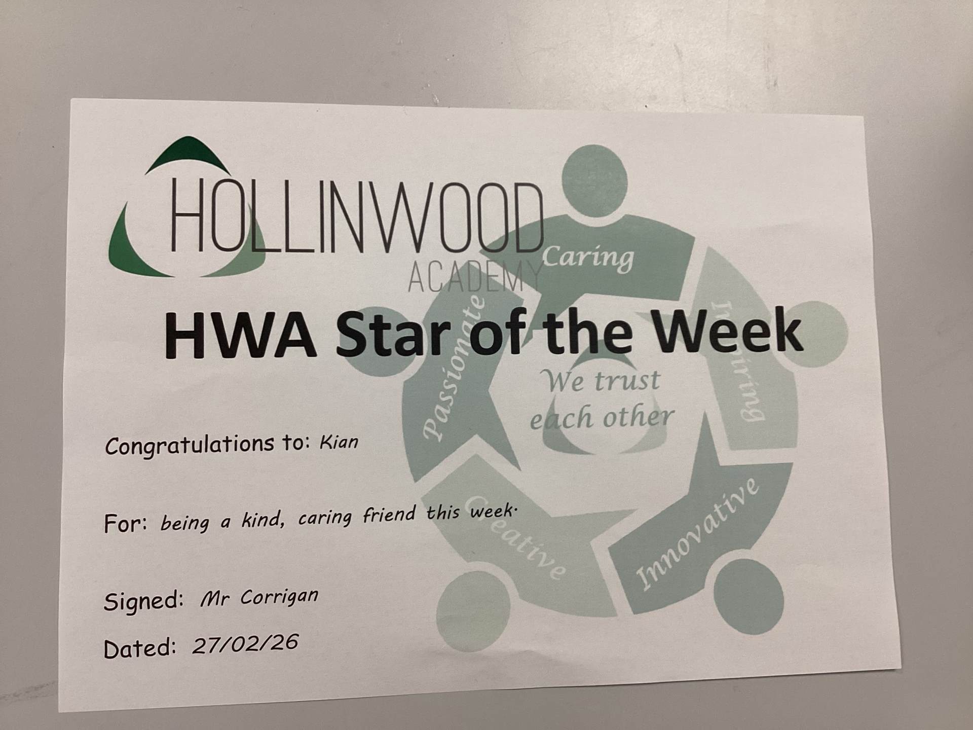 Mr Corrigan’s STAR of the Week is Kian for being a kind, caring friend this week.