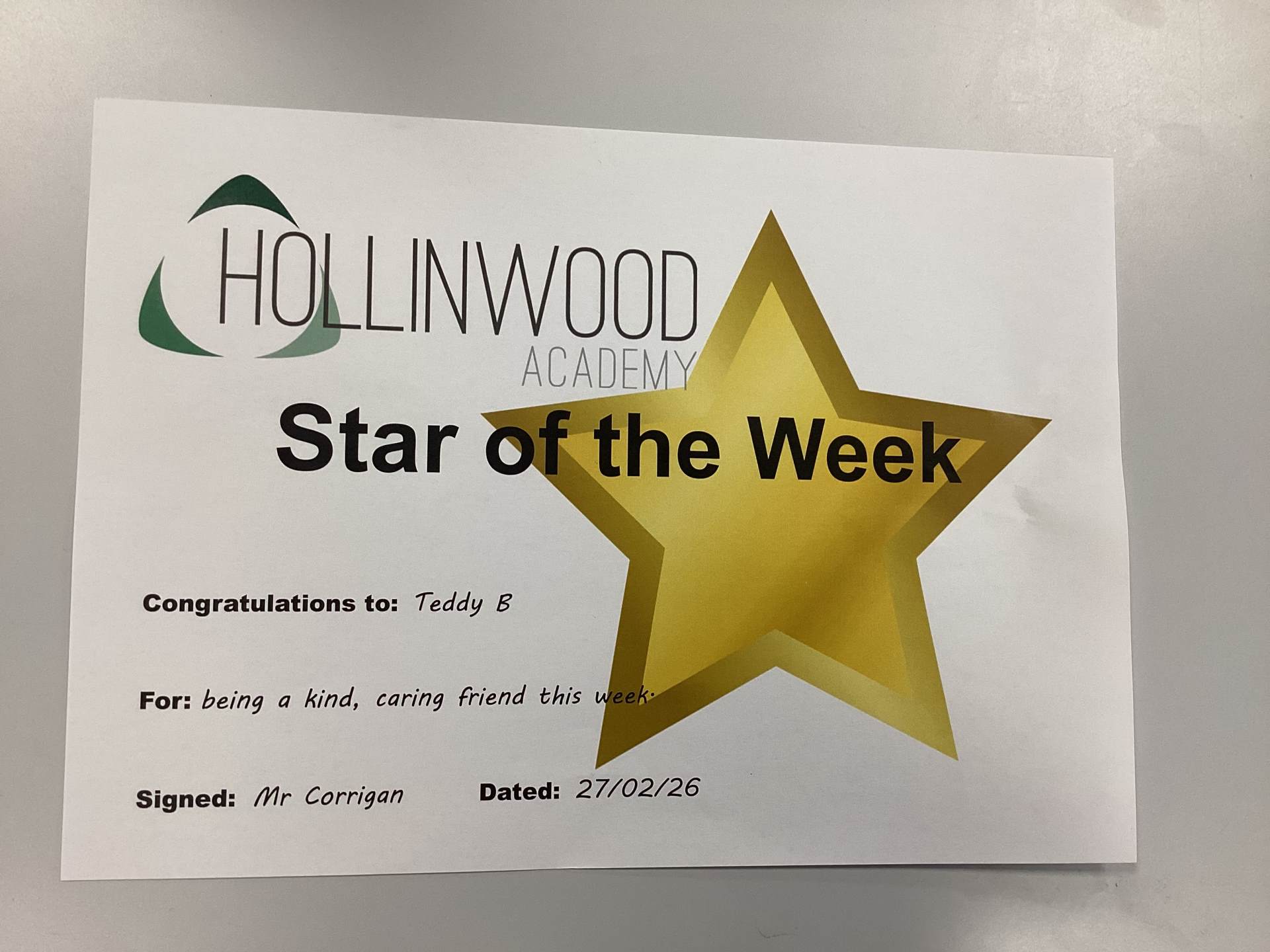 Mr Corrigan’s STAR of the Week is Teddy B for being a kind, caring friend this week.