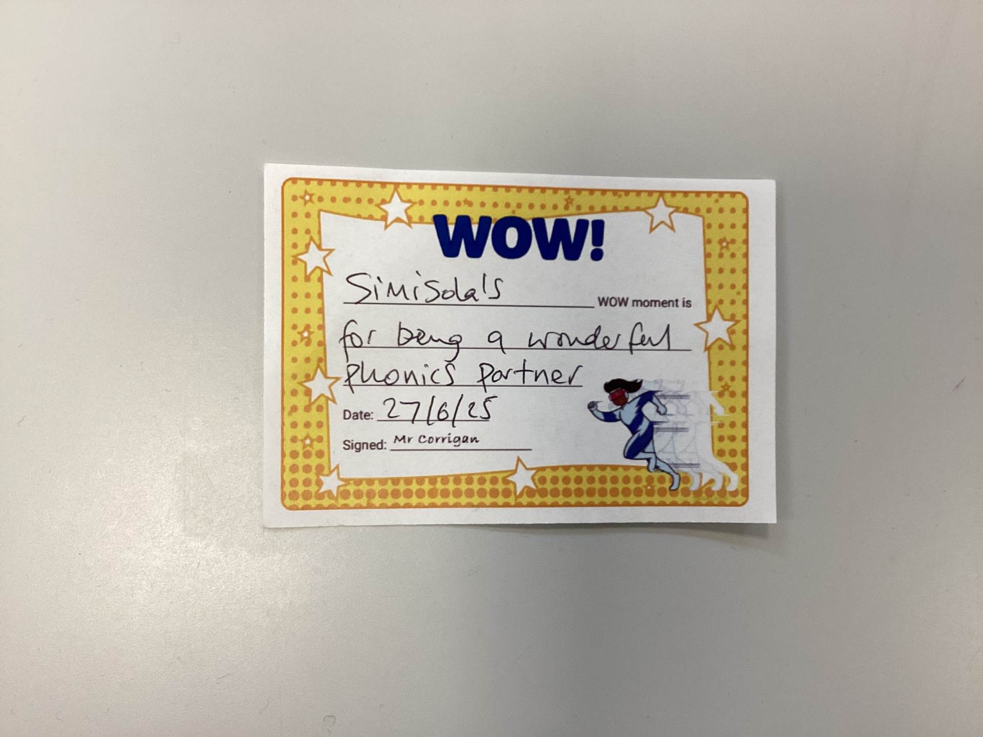 Mr Corrigan’s WOW moment goes to Simisola for being a wonderful Phonics partner.