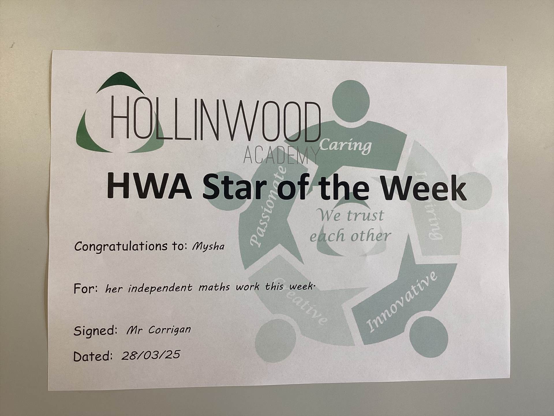 Mr Corrigan’s HWA We are Creative star is Mysha for her independent maths work this week.