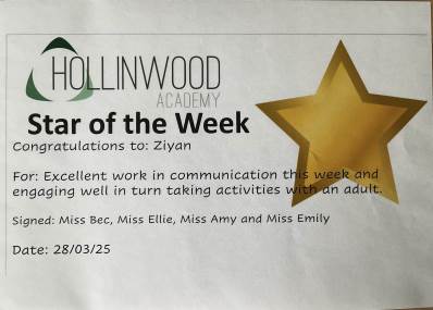 Miss Bailey’s STAR of the week is Ziyan for excellent work in communication this week and engaging well in turn taking activities with an adult.
