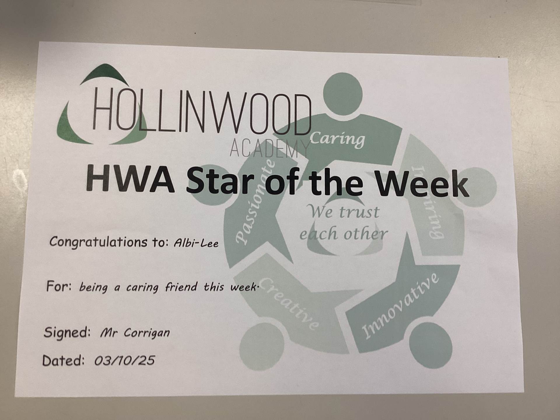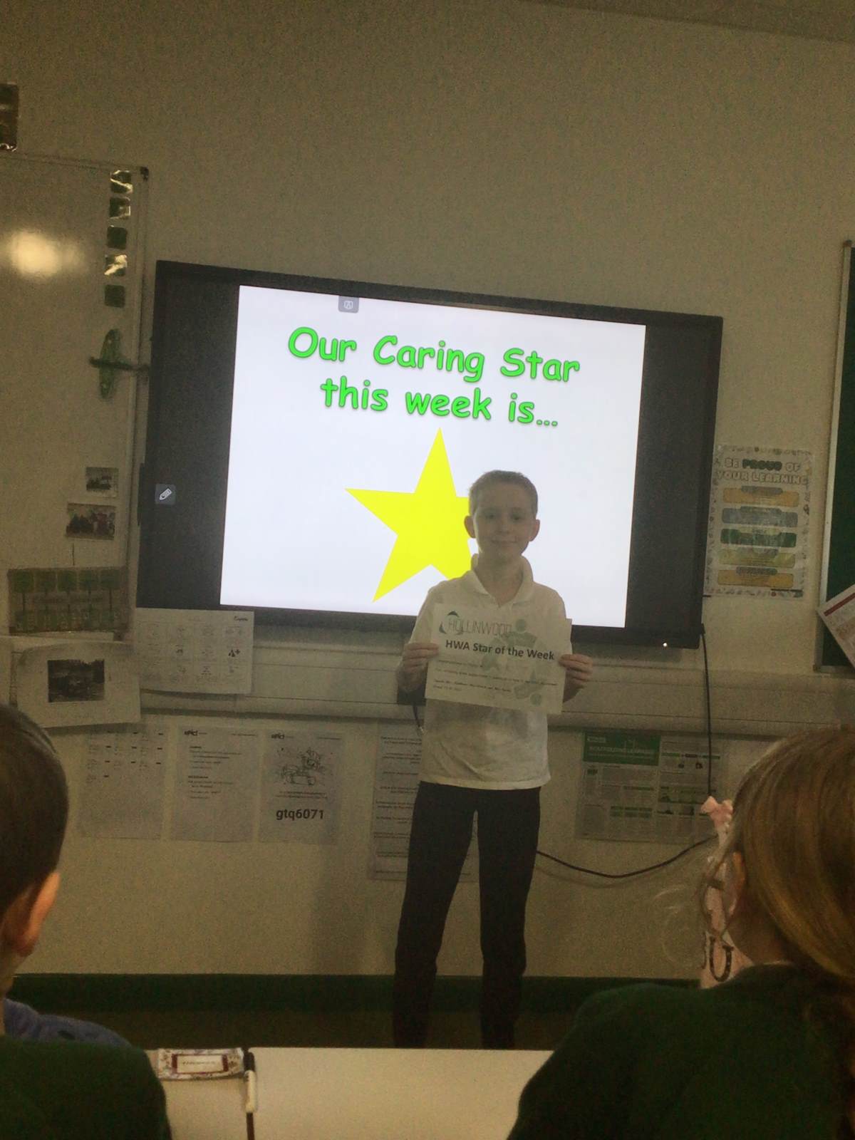Miss Hulme’s HWA We Are Caring goes to Tommy for always being so helpful and volunteering himself for class jobs.