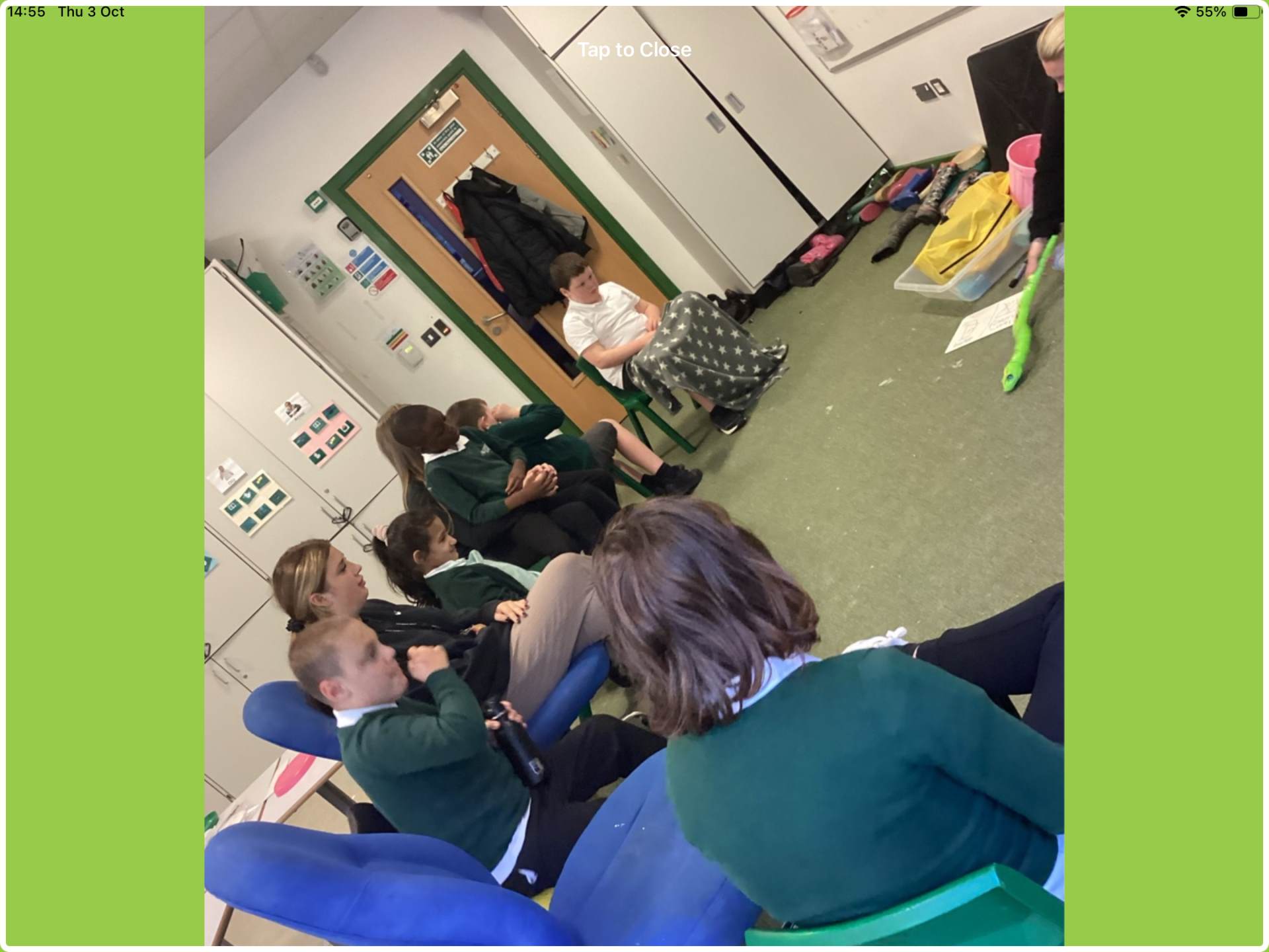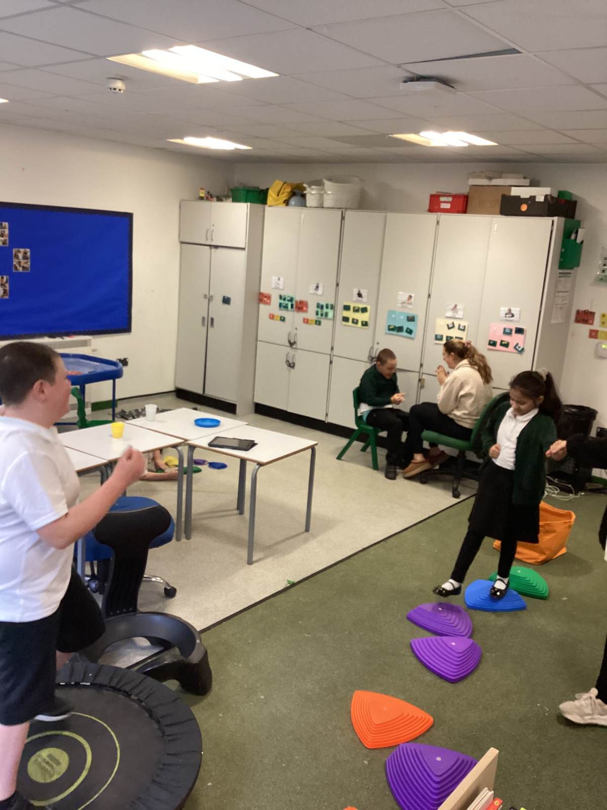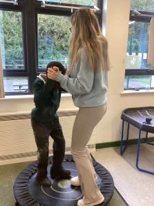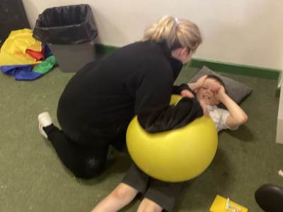 In order to facilitate learning, the children need to be regulated. The class participates in a sensory circuit twice a day and has access to our sensory room and equipment throughout the entire day. Timetabled into the school week are Tac Pac or Sherborne sessions twice weekly. Some children access Tac Pac, while others participate in Sherborne. During the Sherborne sessions, we begin by sitting in a circle and engaging with the song "Everybody Do This." This captures their attention and prepares them to participate. Following this, the children again take ownership by choosing from activities such as being pulled on a wheely chair, rolling on a ball, rocking on the balance board, or jumping on a trampoline. The session concludes with everyone coming back together to relax in whichever way individual students prefer, whether that be lying down, reading a book, playing with sensory toys, or squeezing some playdough.