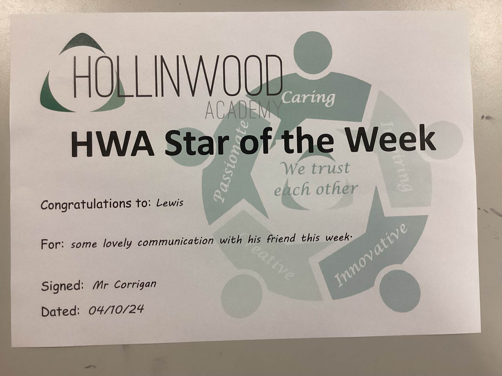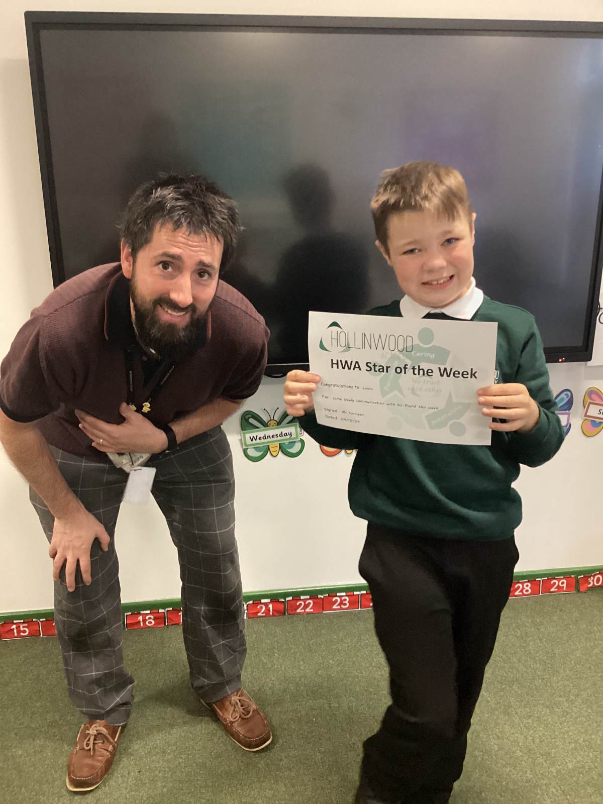 Mr Corrigan’s HWA We are Caring star is Lewis for some lovely communication with his friend this week.