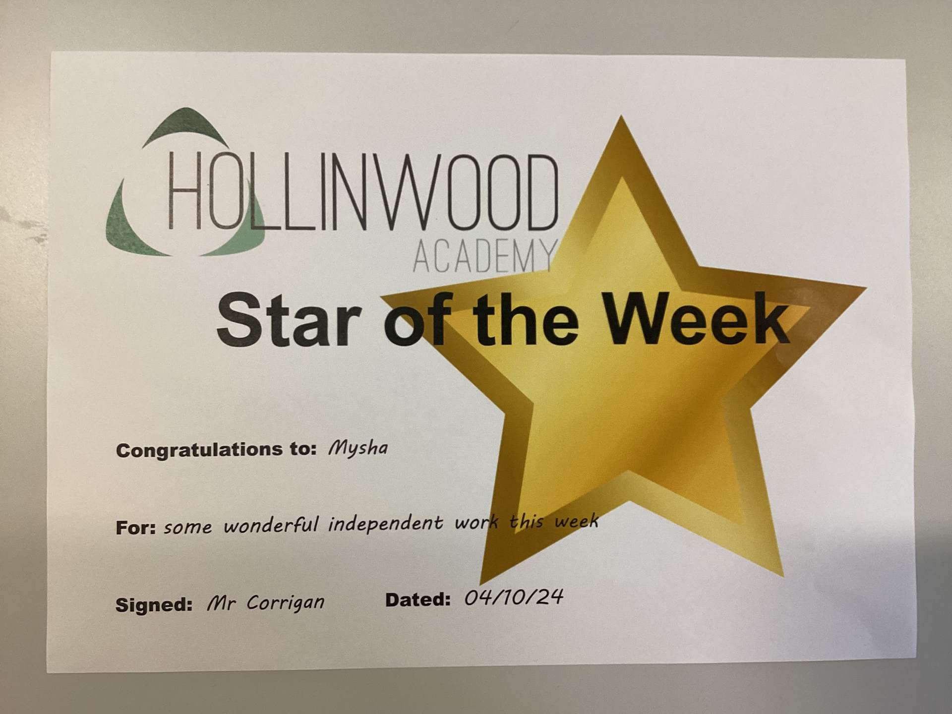 Mr Corrigan’s STAR of the week is Mysha for some wonderful independent work this week.