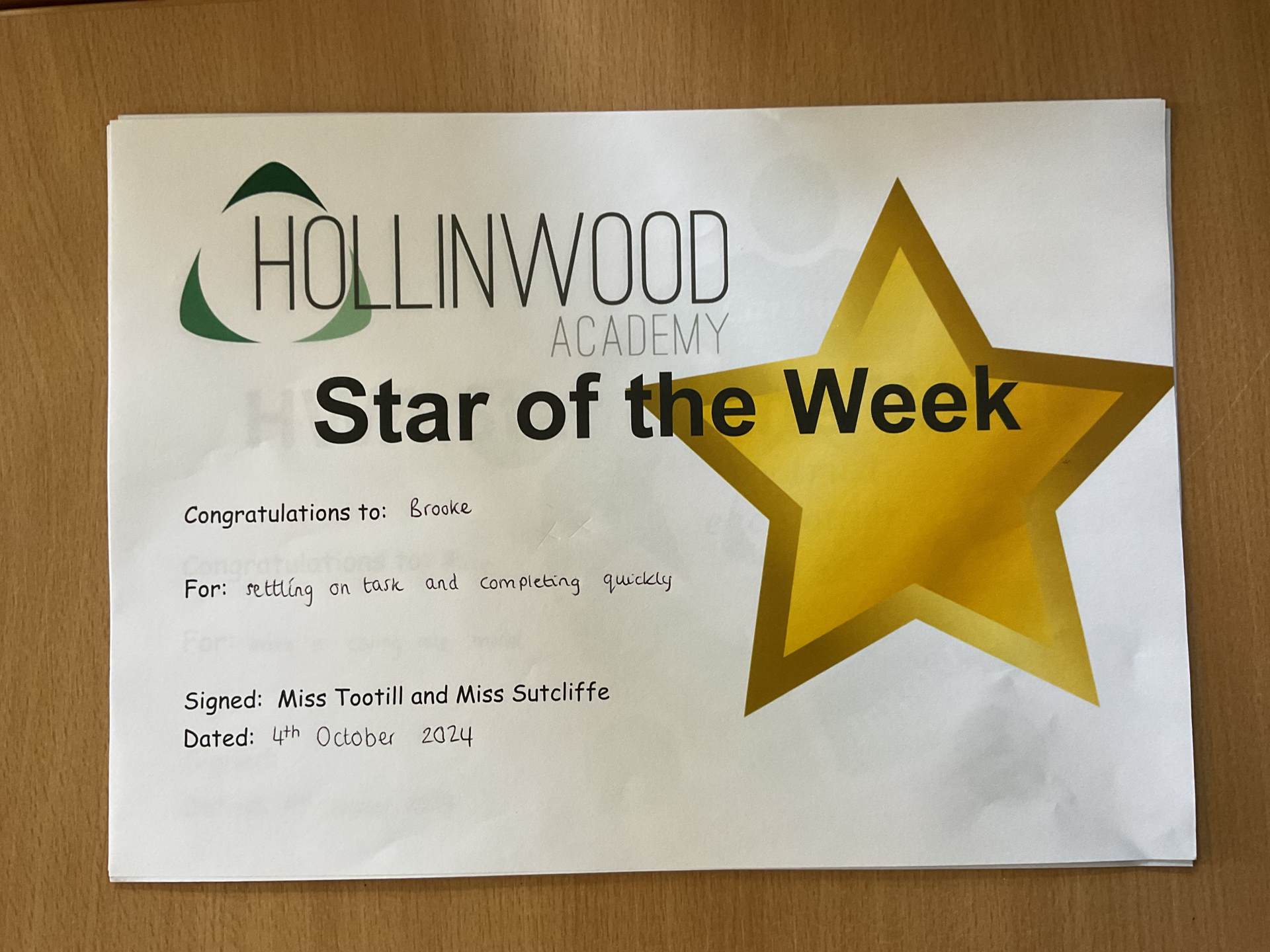Miss Tootill’s STAR of the week is Brooke for settling onto tasks and complete quickly.