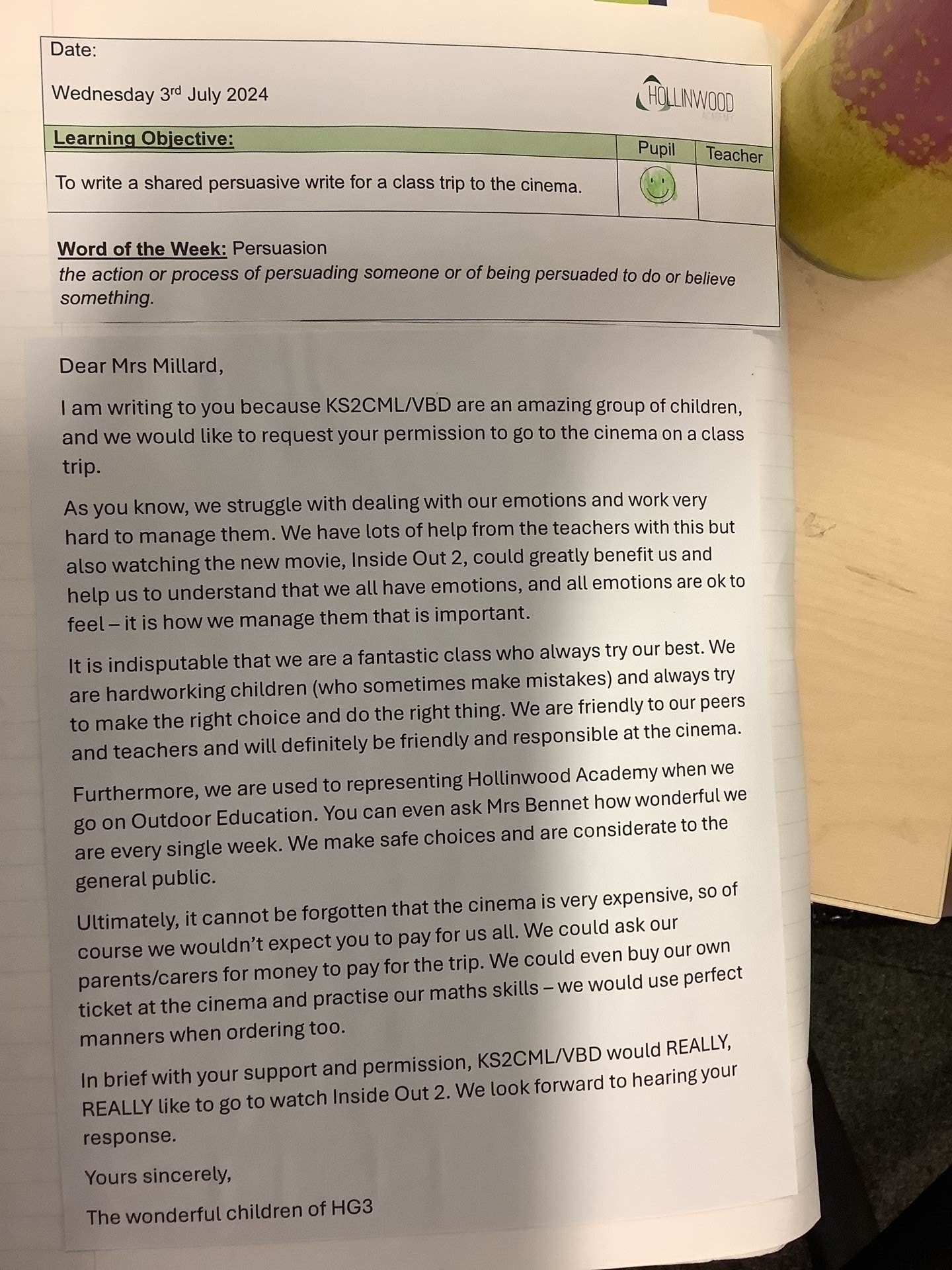 During English this week, we have been exploring persuasive writing – the children contributed to a shared write with Miss McDonald to persuade Mrs Millard to let them go and see Inside Out 2 at the cinema! We received the news on Friday and Mrs Millard has agreed to the trip! The children were elated."