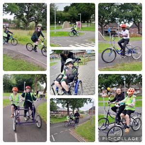 The children have been cycling at a community in Cheadle for the past few weeks as part of Outdoor Education – they really enjoy the course and the small community where they learn about road safety and rules of the road.