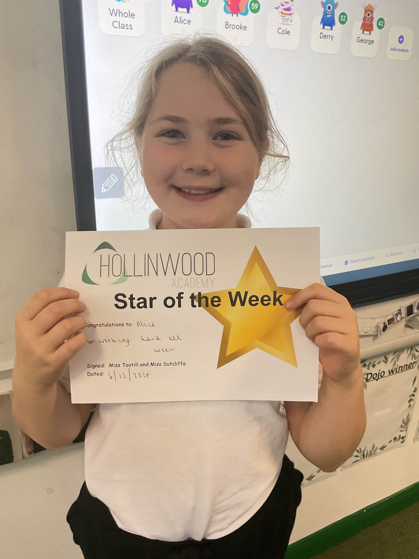 Miss Tootill’s STAR of the week is Alice for working hard all week.