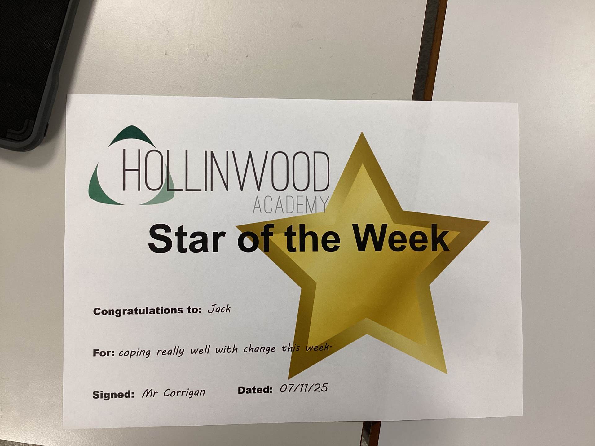 Mr Corrigan’s STAR of the Week is STAR Jack for coping really well with change this week.