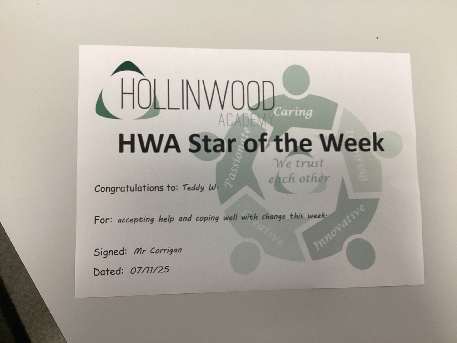Mr Corrigan’s STAR of the Week is Teddy W for accepting help and coping well with change this week.