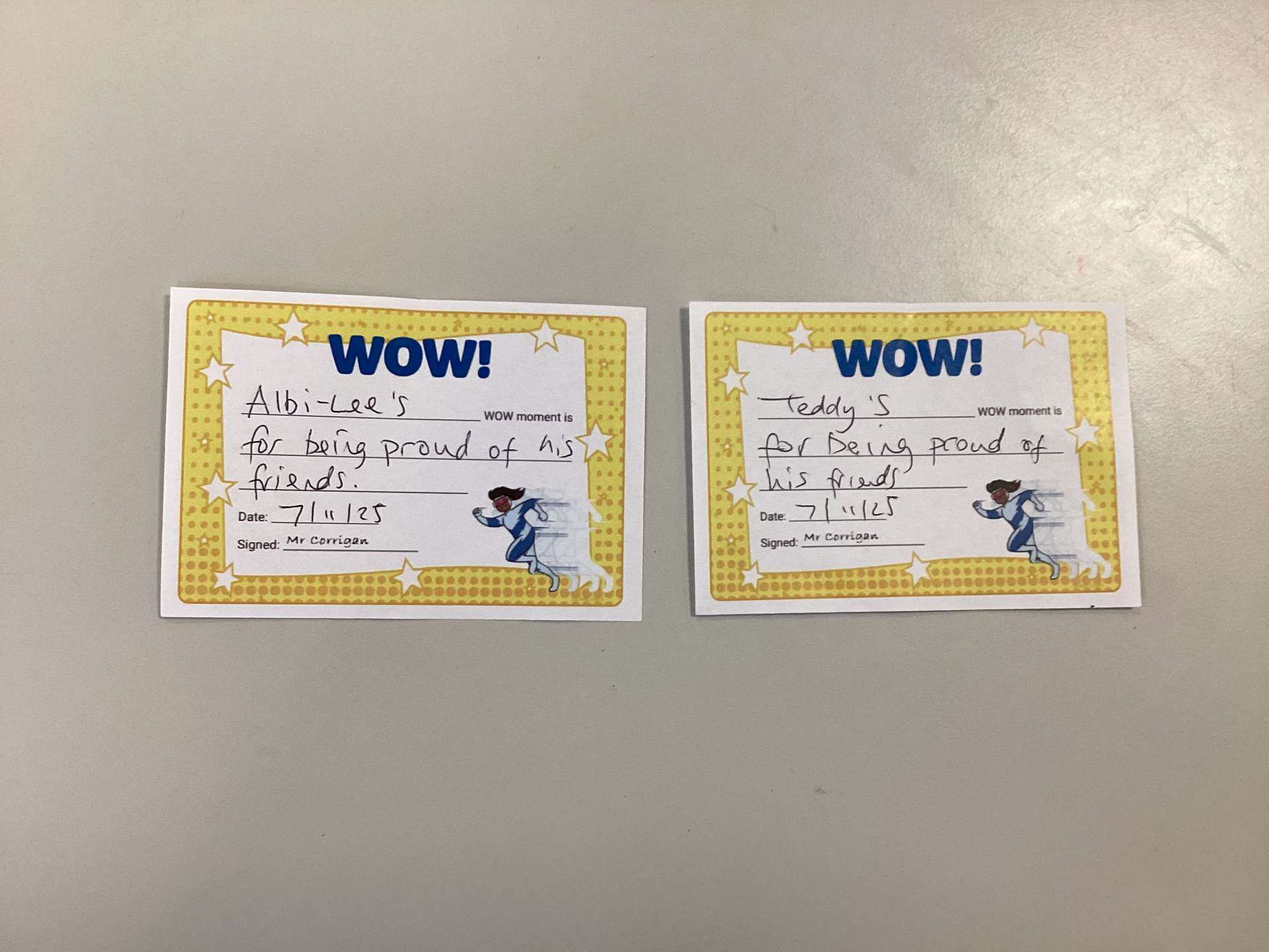 Mr Corrigan’s WOW moments go to Albi-Lee & Teddy B for being proud of their friends.