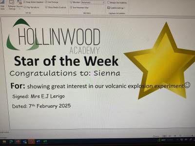 Mrs Lerigo’s STAR of the week is Sienna for showing great interest in our volcanic explosion experiment.