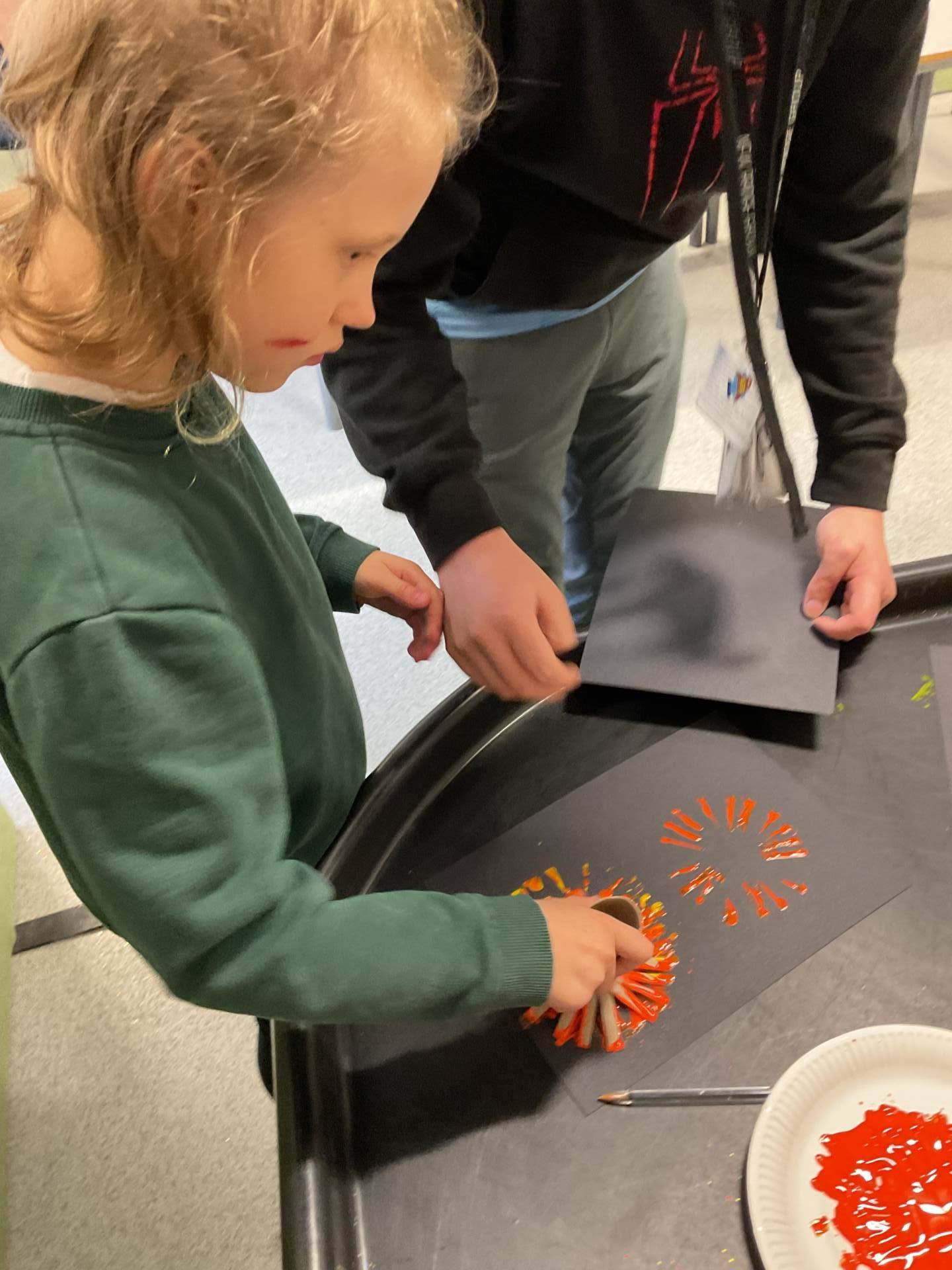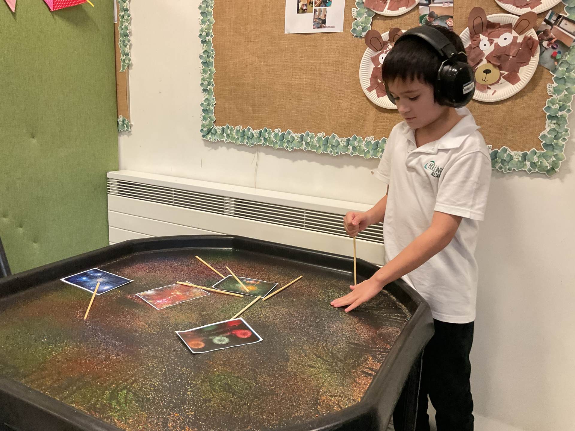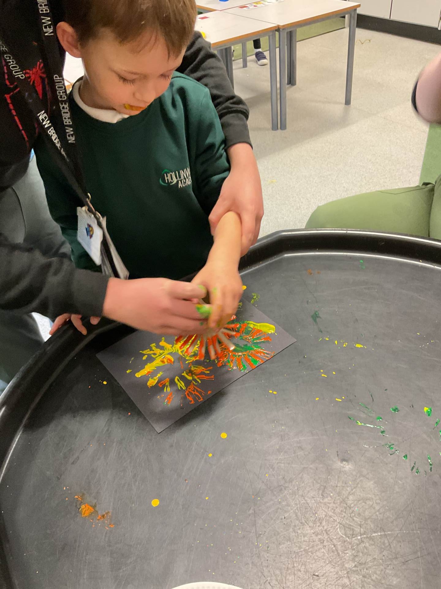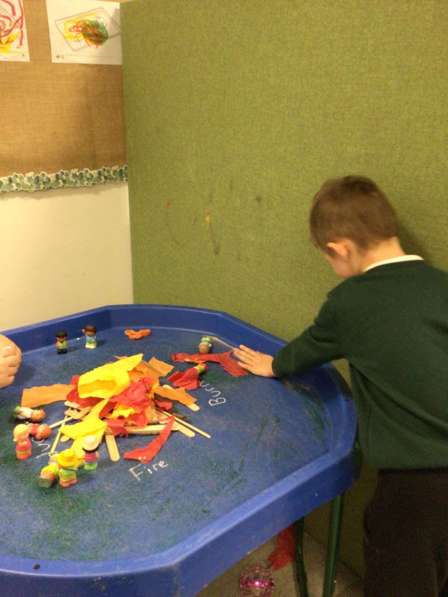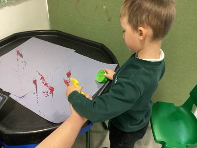 "We have had a busy week this week in Engage One! Our sensory story sessions have taken us on an adventure with a little boy named Rocco, who attends a spectacular bonfire event. We have thought about all the different sounds Rocco heard and all of the things he saw, from the crunching leaves under his feet, to the crackling fire and magnificent fireworks. We have had lots of fun creating our own firework art in lots of different ways including painting, printing and sensory mark making too – we produced some beautiful colourful designs.