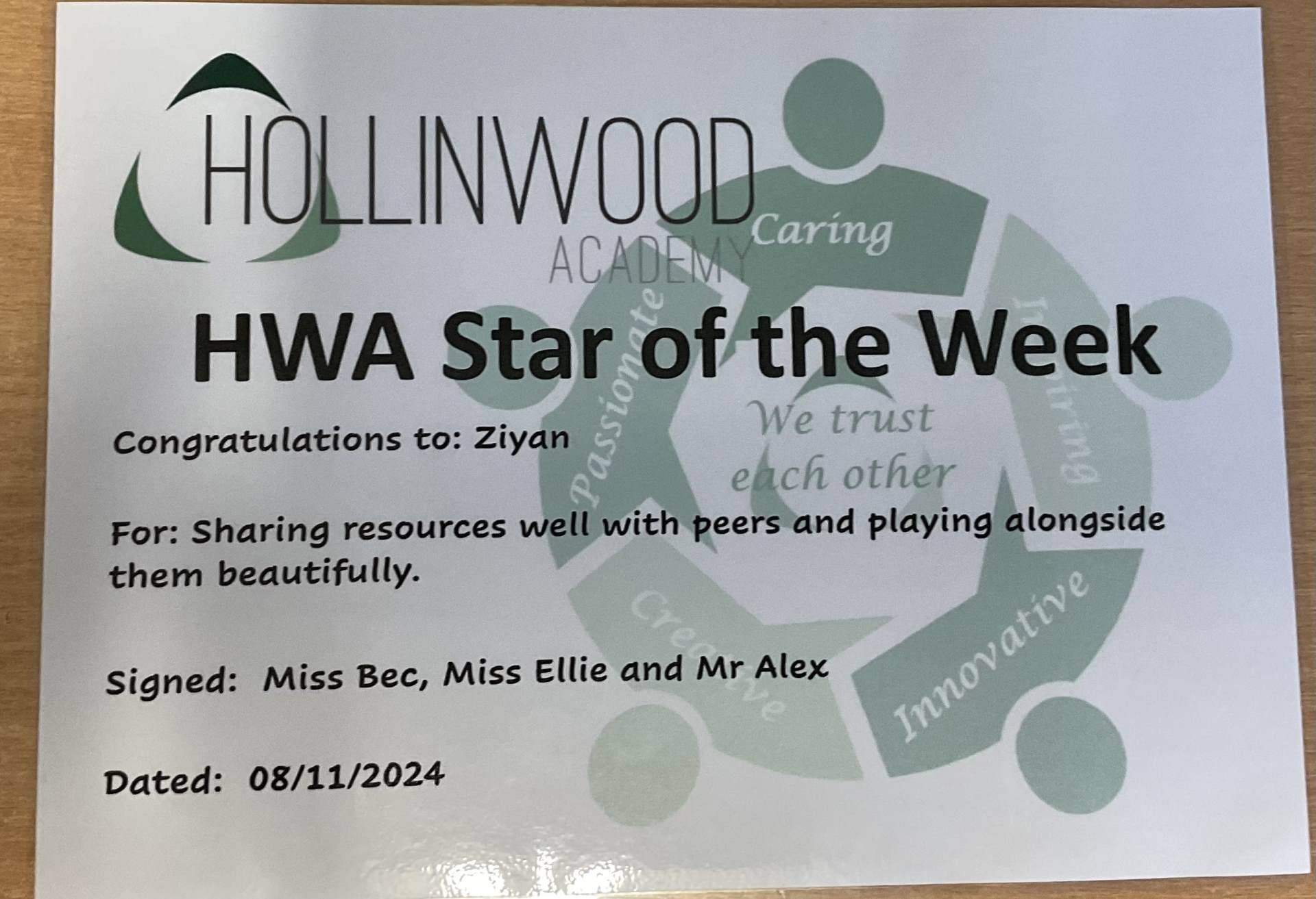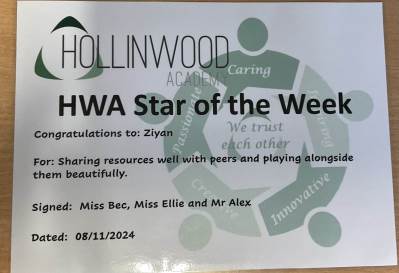 Miss Bailey’s HWA We are Inspiring STAR is Ziyan for sharing resources well with peers and playing alongside them beautifully.