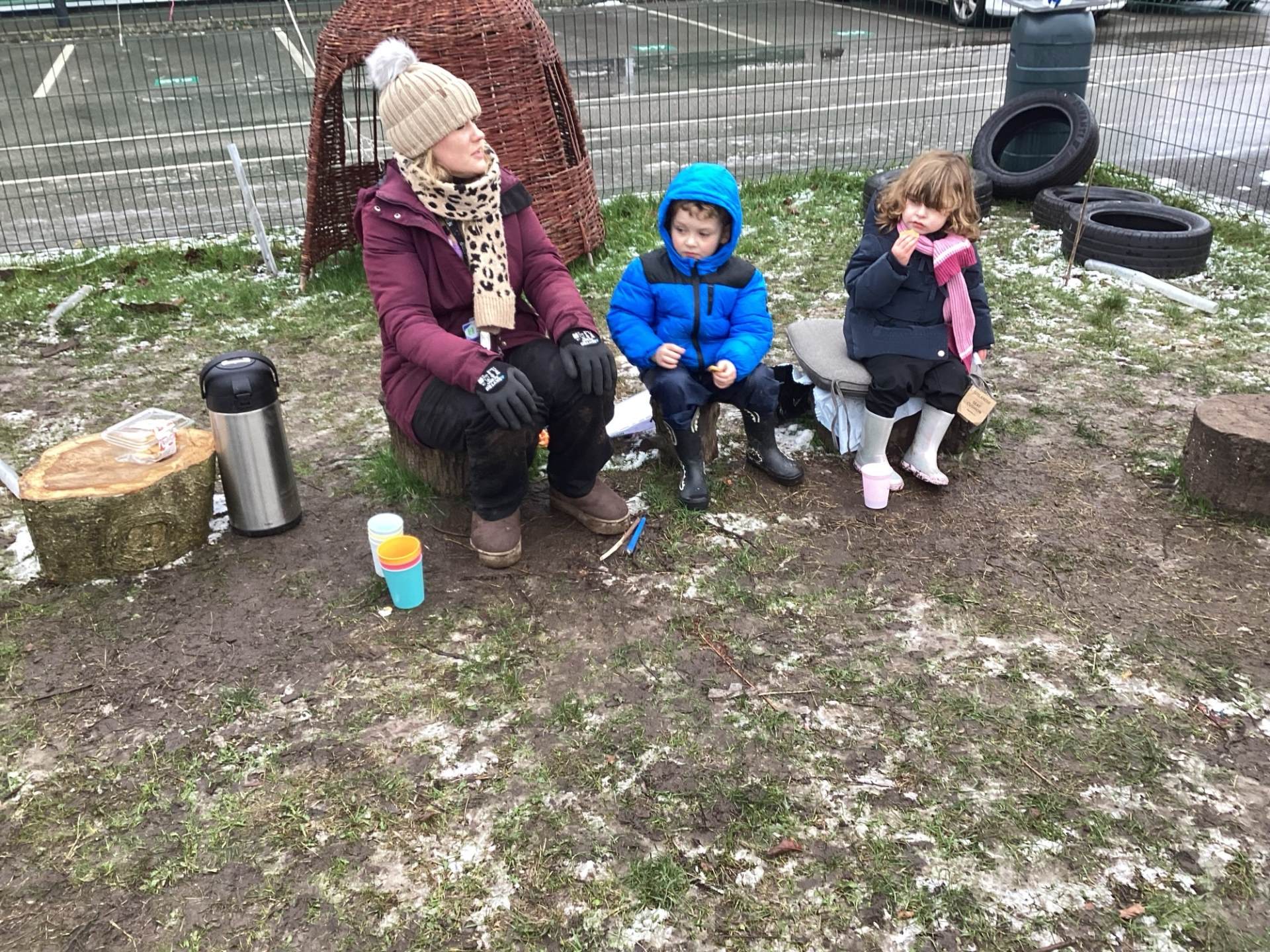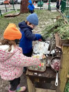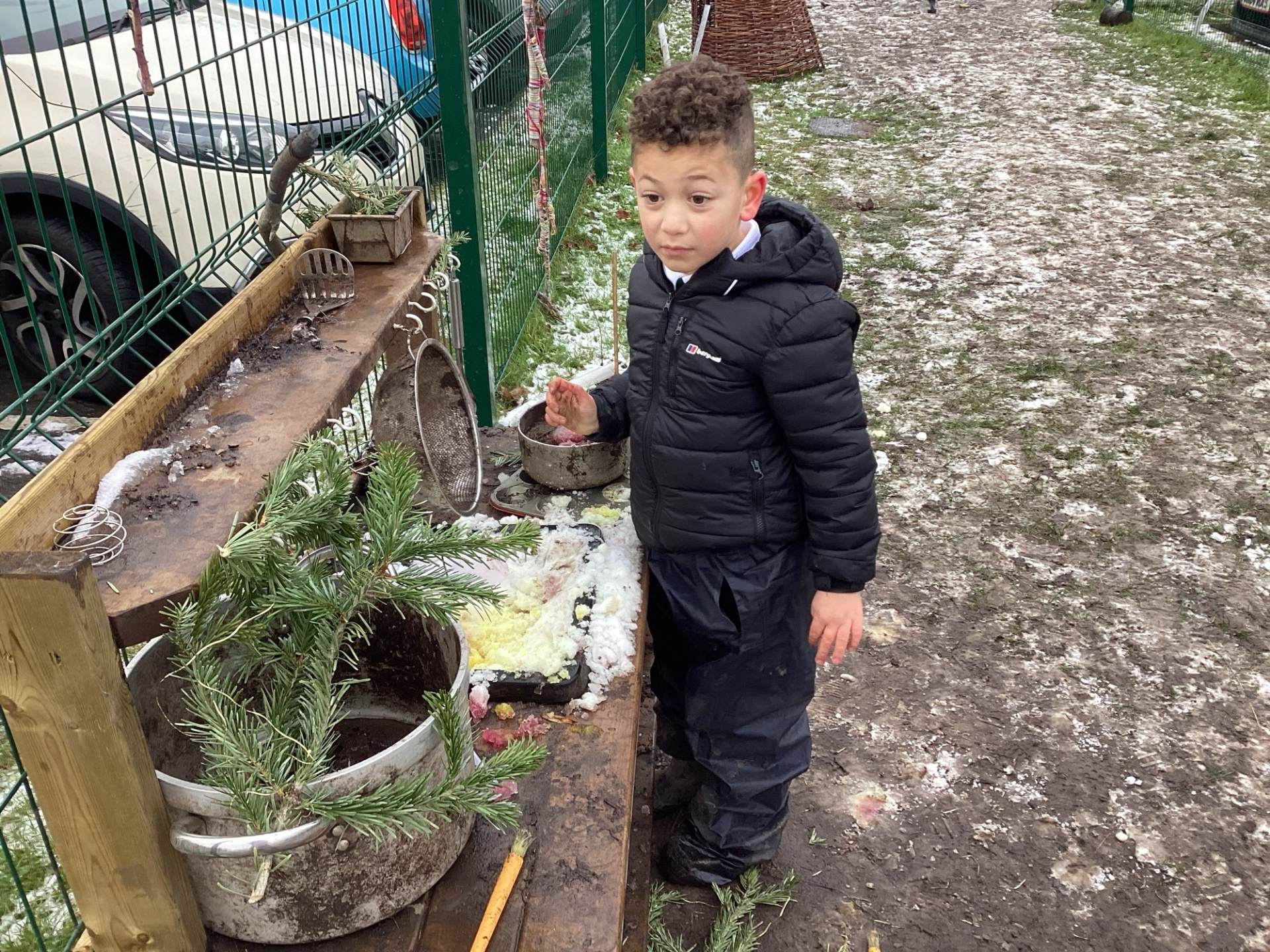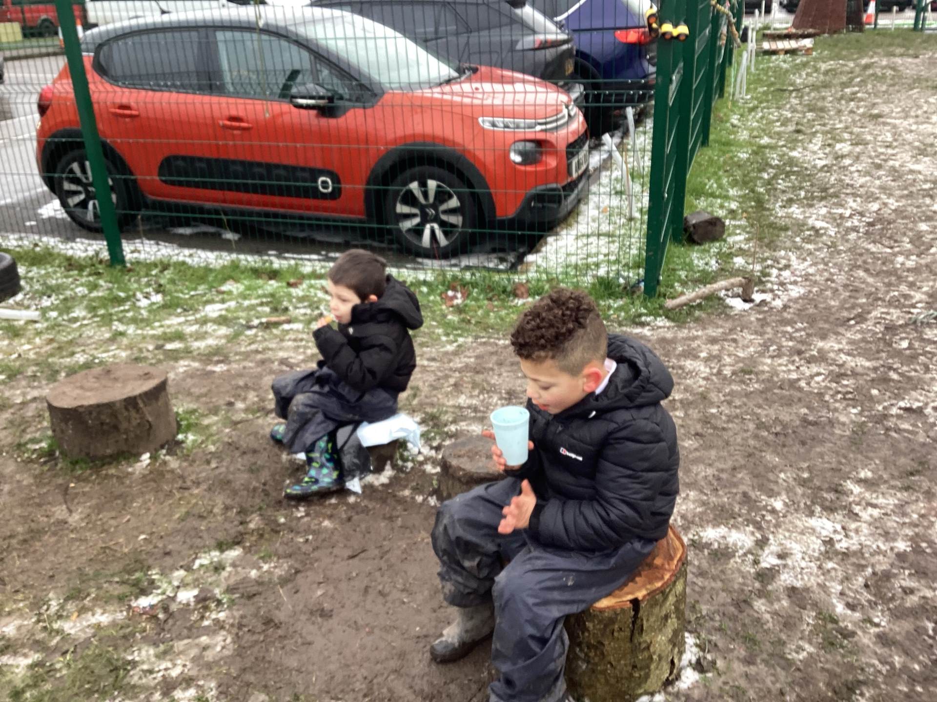 In Forest School this week we really enjoyed a snowy session! We explored signs of Winter that we would see and joined in with a poem all about Winter. The children loved making footprint and crunching the snow underneath their wellies. In the mud kitchen we made snowcakes and decorated them with food colouring. To end the session we enjoyed a warm hot chocolate and a gingerbread man biscuit whilst sat around our basecamp singing “Ram Sam Sam”."