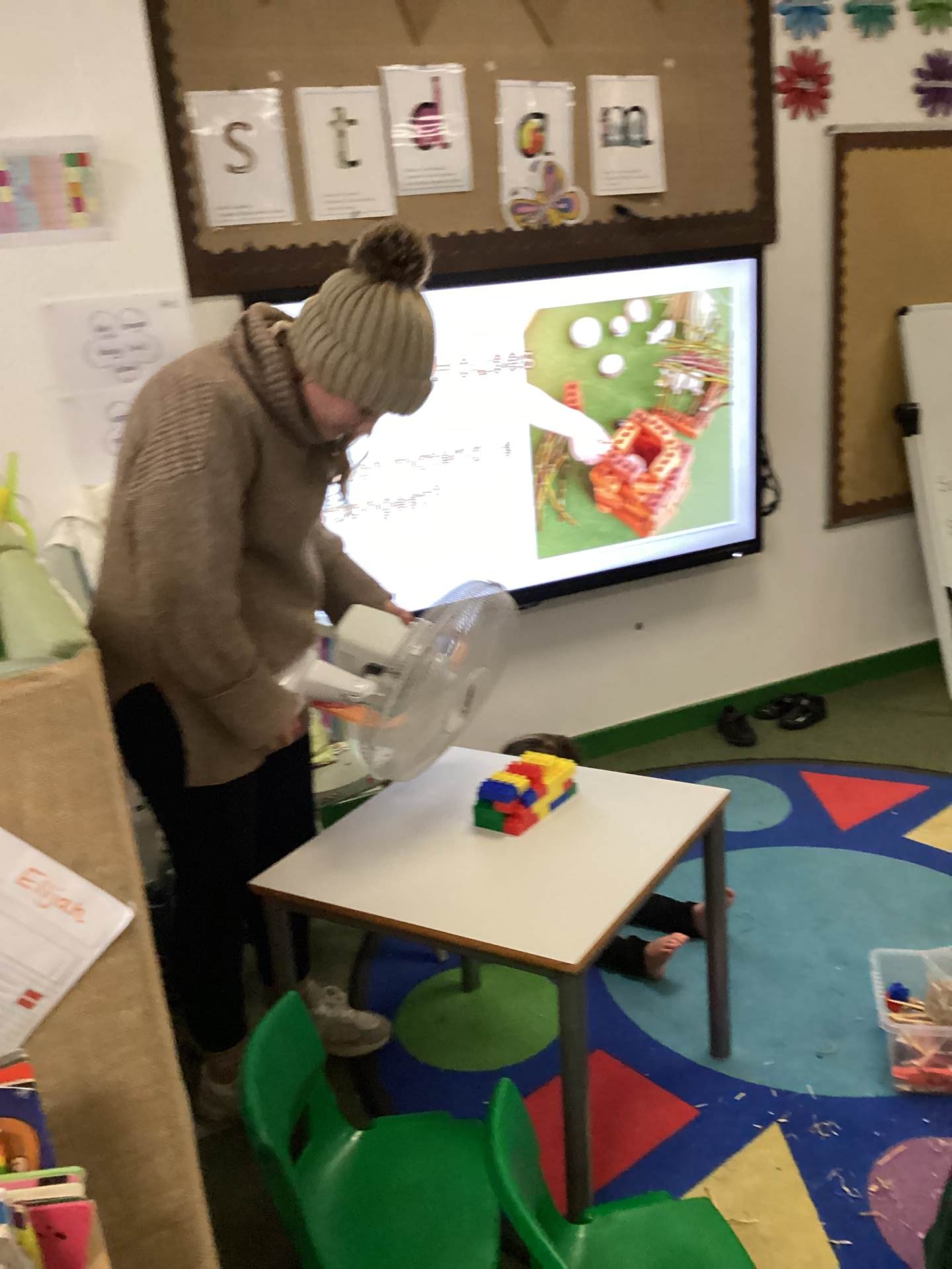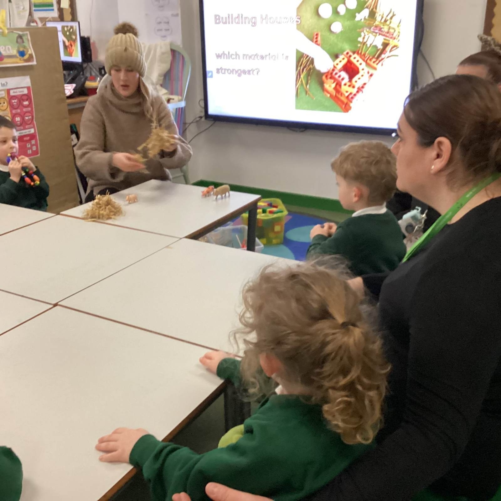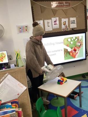 In Science this week we have been investigating what material is strong and what is week, using our Three Little Pigs story as inspiration! First Miss Callan built a house of straw, sticks and bricks, then we used a fan to blow the house (just like the big bad wolf) using our repeated refrains from the story. We enjoying finding out which materials were weak and fell down and which were strong and stayed up. The children then enjoyed making their own houses, choosing which materials to use. We all became wolves, blowing down our houses to find out if they were strong or weak!