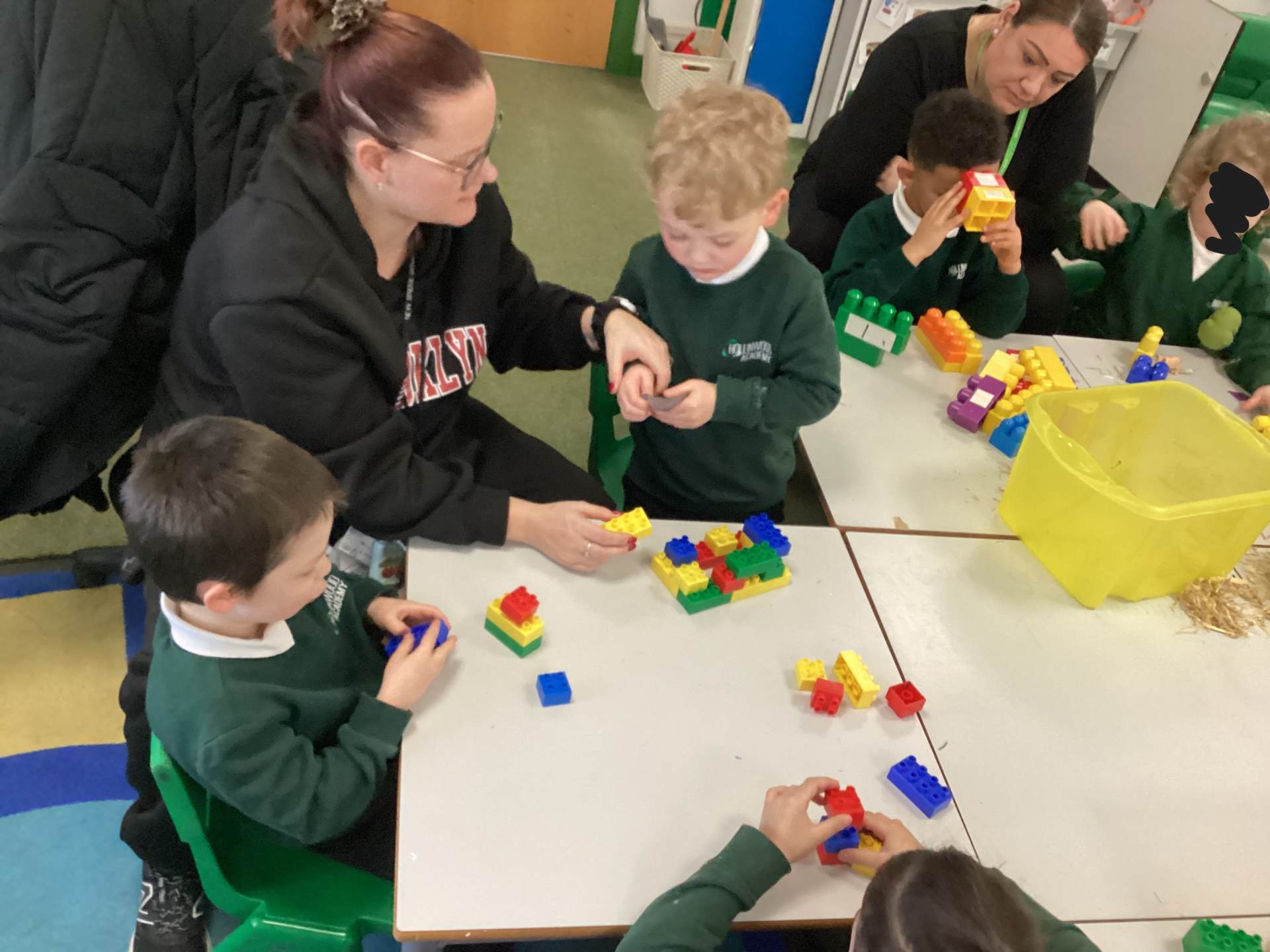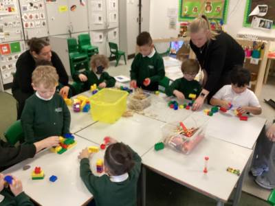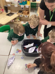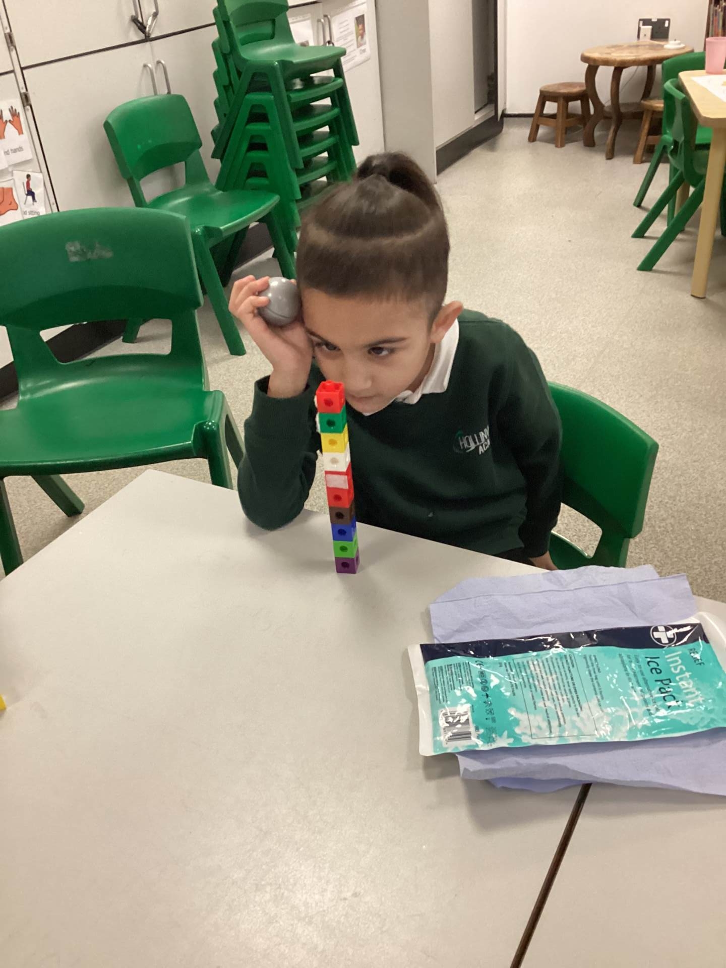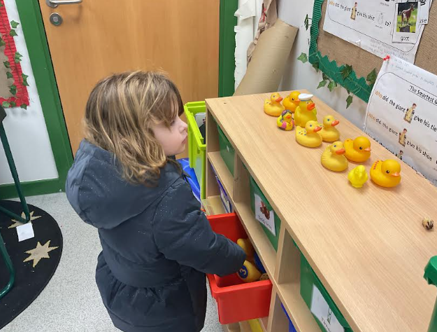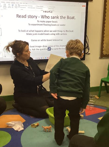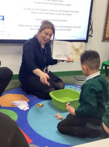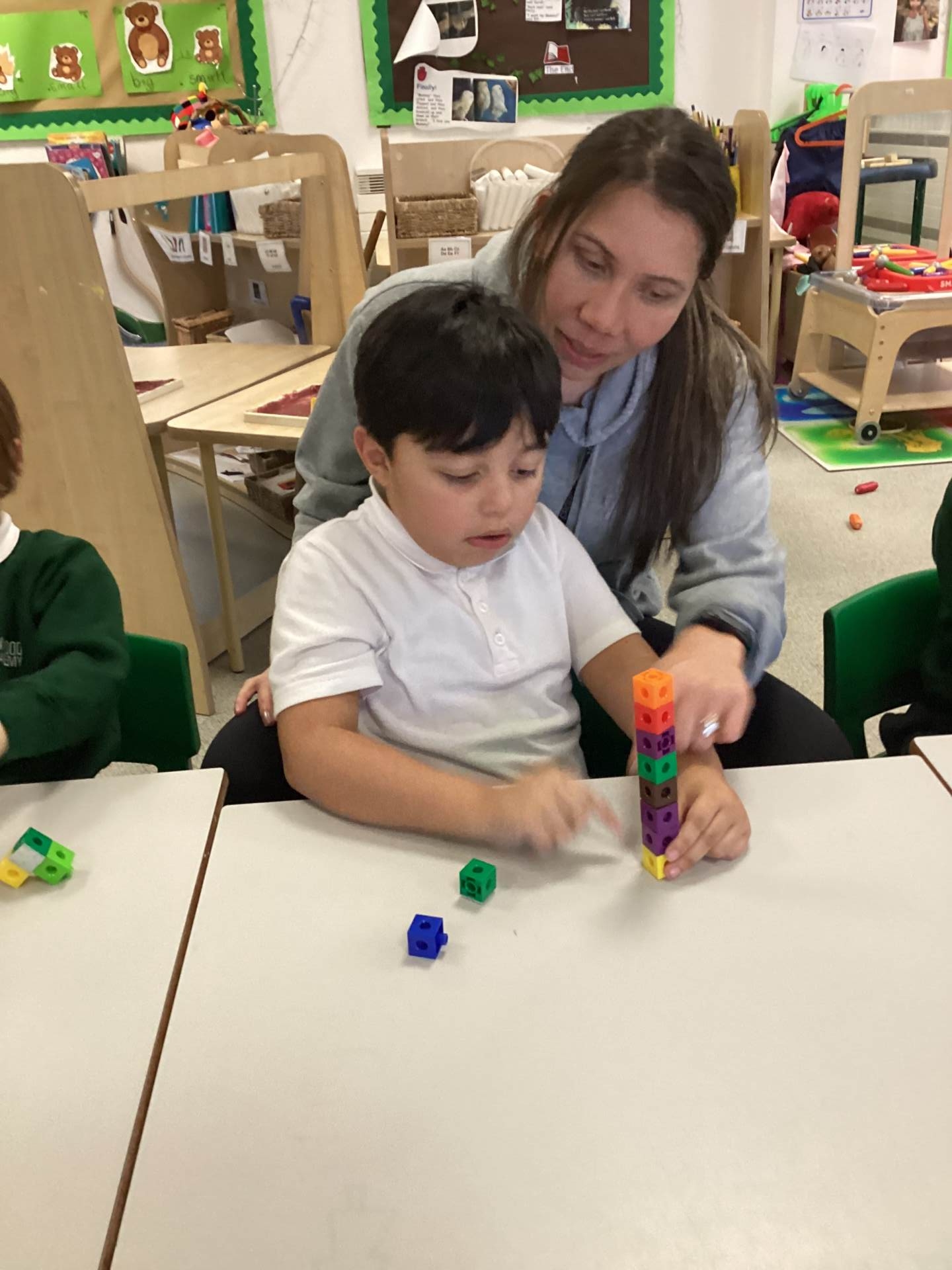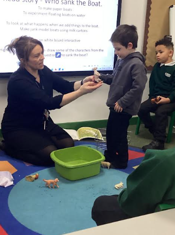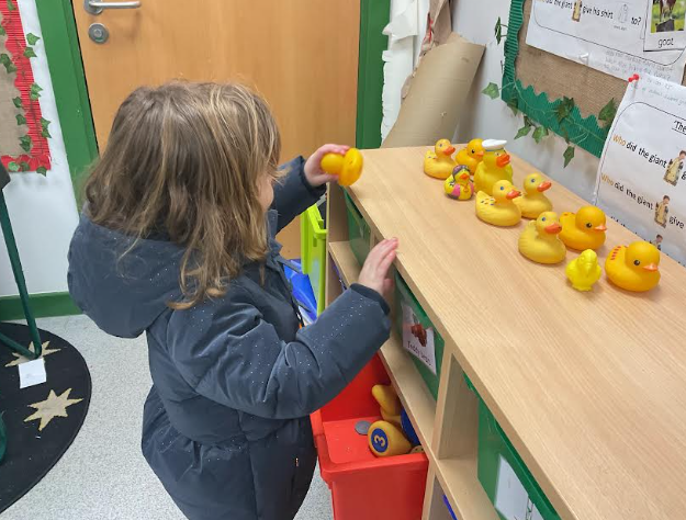In maths we have been learning about capacity. We looked at heaviest and lightest. We then read a story called Mr Gumpty’s Outing, the book is all about a man who goes out on his boat and lots of animals’ pile on to the boat. The boat begins to tip, and all the animals fall into the water. We then made our own paper boats and coloured them. We then went into small groups to re-enact the story. We have also been looking at the numbers 6, 7, and 8. We have practiced writing them and counting up to them. We have been building towers, by counting out the right number of cubes and shouting “STOP” when we reach the right number, to help us learn to count out objects from a larger group. We have also been painting the numbers and stamping 6, 7, and 8 times- remembering to stop too.