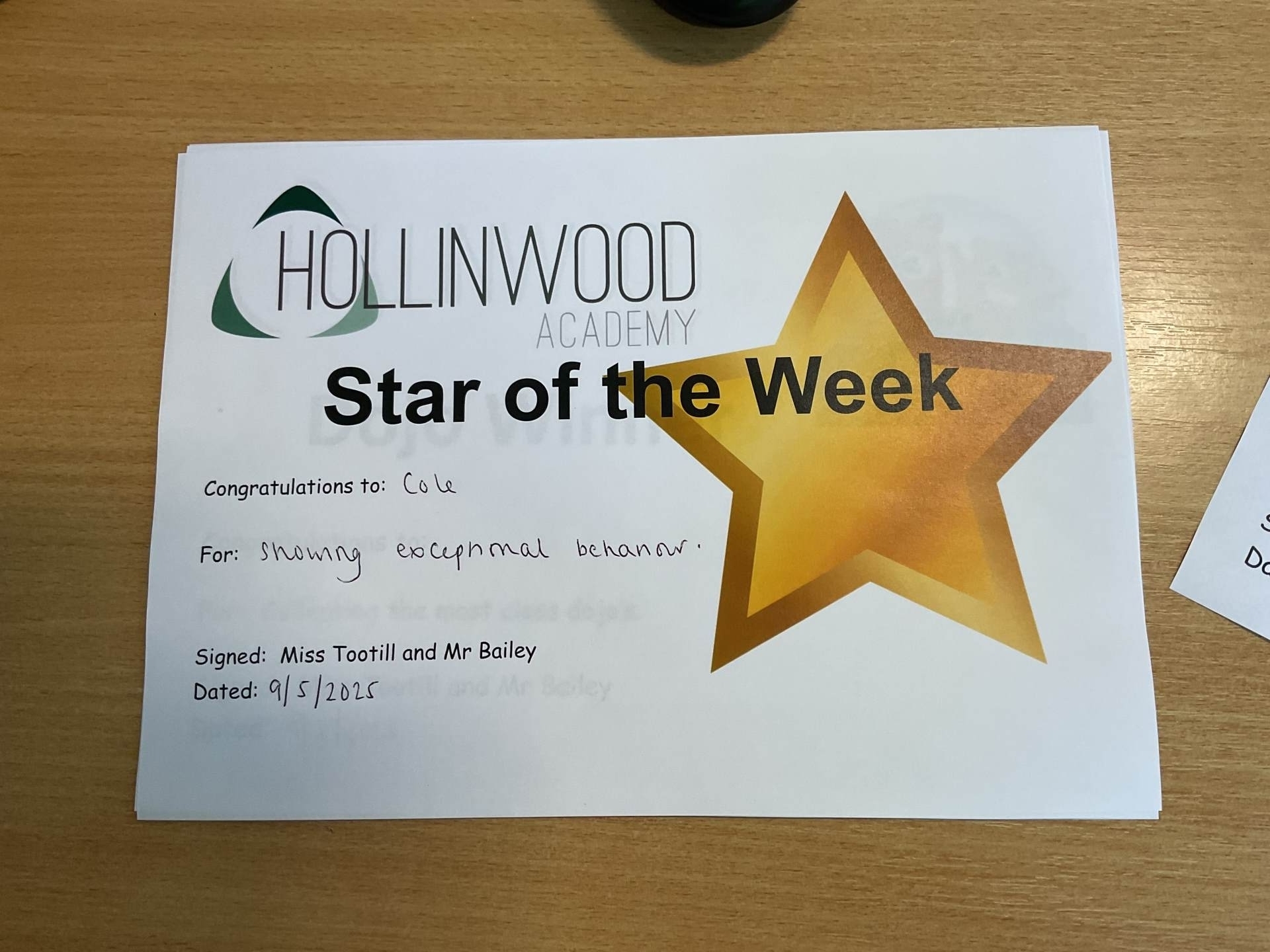Miss Tootill’s STAR of the week is Cole for showing his exceptional behaviour.